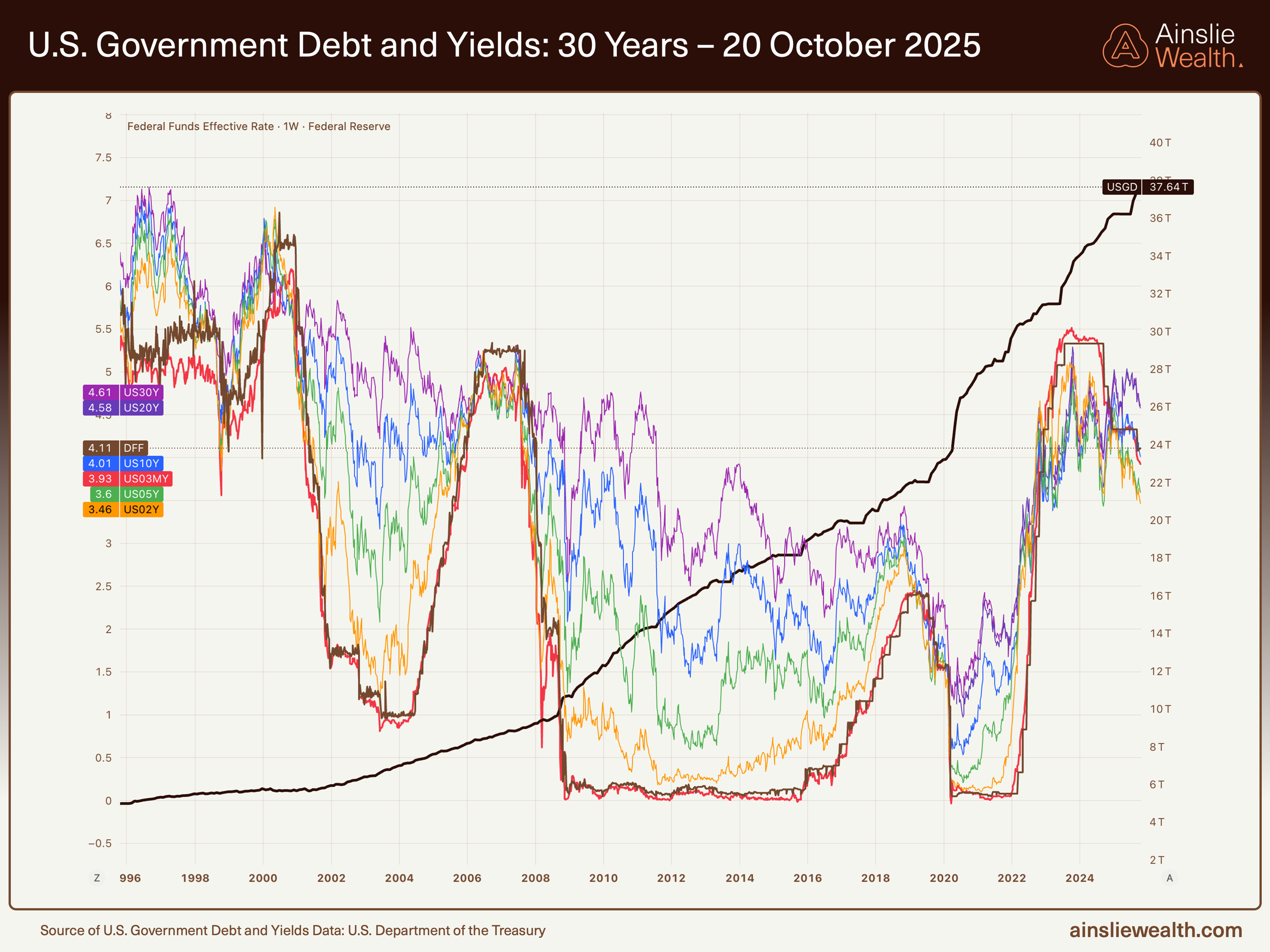 U.S. Fed Funds Effective Rate vs Yield Curve and Total Government Debt.